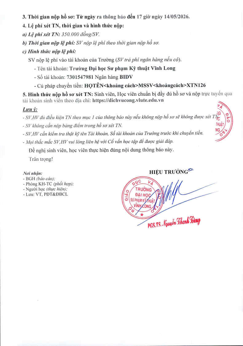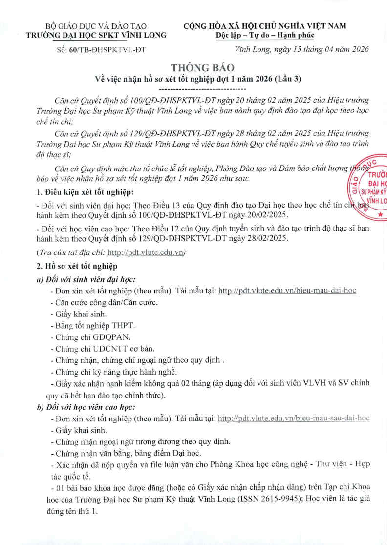 Thông báo về việc nhận hồ sơ xét tốt nghiệp đợt 1 năm 2026 (Lần 3)